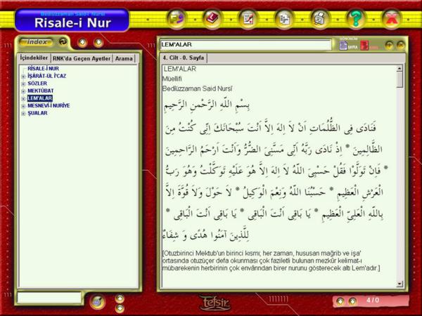 E. Hamdi Yazır Meali, H. Basri Çantay Meali, Suat Yıldırım Meali, Diyanet İşleri Bşk. Meali, Ömer Nasuhi Bilmen ”Kur’an-ı Kerim Meali”, Said Havva “El-Esas Fi’t-Tefsir” , Seyyid Kutub “Fi Zilal-il Kur’an”, Ebul Ala Mevdudi “Tefhimu’l Kur’an”, Said Nursi “Risale-i Nur”, İngilizce ve Almanca Dil Seçenekleri ve ayrıca Recep AYKAN’ın hazırladığı 3 ayrı dilde Kur’an-ı Kerim Fihristi